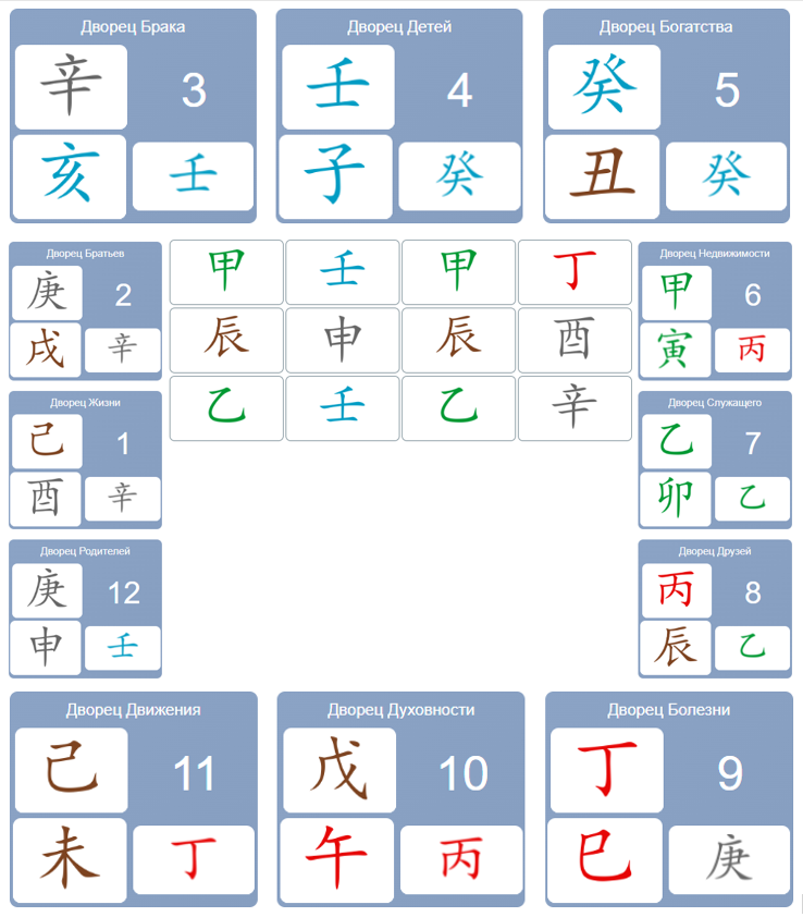1-я часть: дата рождения человека переводится в 8 иероглифов (4 Небесных ствола и 4 Земные ветви). Эти иероглифы представляют взаимоотношение между 5-ю элементами, соотносящимися с разными аспектами нашей жизни.