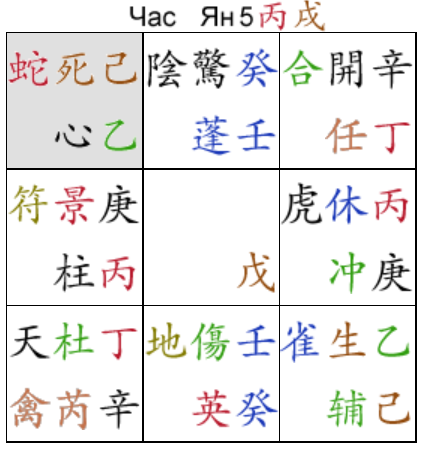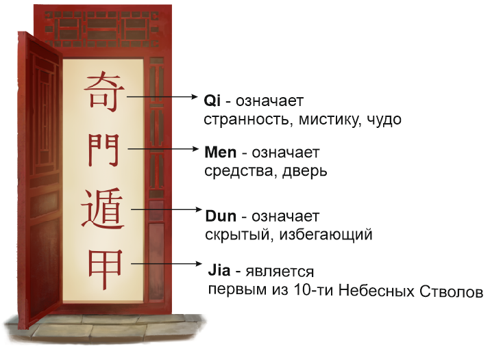 Т.о. эти 4 понятия означают, что 甲 (Jia) прячется каким-то мистическим путём за некой тайной дверью. Это самый важный генерал, который спрятан таким образом, чтобы противник не знал где он, и не смог его атаковать.