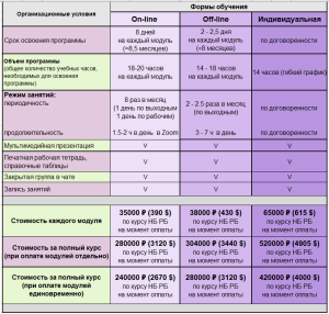 - Off—line (интенсив). Занятия на каждый модуль проводятся 1 раз в месяц 2 дня, по выходным, с 10.00 до 19.00 (предусмотрены кофе-паузы, перерывы на обед).